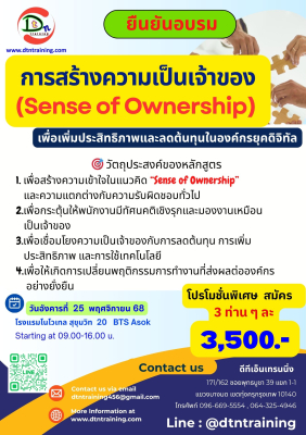 Sense of Ownershipเป็นคุณลักษณะที่ช่วยให้พนักงานทำงานเชิงรุก มีความรับผิดชอบสูง และใส่ใจในผลลัพธ์ของงานราวกับเป็นเจ้าขององค์กรเอง ซึ่งจะนำไปสู่การปรับปรุงงาน ลดความสูญเปล่า และสร้างวัฒนธรรมองค์กรที่แข็งแกร่งในยุคดิจิทัลที่มีการเปลี่ยนแปลงตลอดเวลา