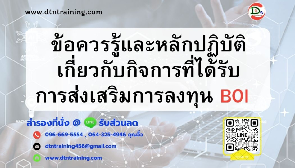 การได้รับการส่งเสริมการลงทุนจากสำนักงานคณะกรรมการส่งเสริมการลงทุน (BOI)เป็นสิทธิประโยชน์สำคัญที่ช่วยให้ธุรกิจสามารถลดต้นทุนทางภาษีและเพิ่มความสามารถในการแข่งขัน อย่างไรก็ตาม กิจการที่ได้รับส่งเสริมจะต้องปฏิบัติตามเงื่อนไขและข้อกำหนดที่กำหนดไว้อย่างเคร่งครัด หลักสูตรนี้จะให้ความรู้ที่ถูกต้อง ครอบคลุม และสามารถนำไปปฏิบัติจริงได้อย่างถูกต้อง เพื่อป้องกันความเสี่ยงจากการถูกเพิกถอนสิทธิหรือไม่สามารถใช้สิทธิได้