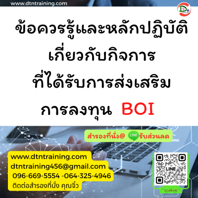 การได้รับการส่งเสริมการลงทุนจากสำนักงานคณะกรรมการส่งเสริมการลงทุน (BOI)เป็นสิทธิประโยชน์สำคัญที่ช่วยให้ธุรกิจสามารถลดต้นทุนทางภาษีและเพิ่มความสามารถในการแข่งขัน อย่างไรก็ตาม กิจการที่ได้รับส่งเสริมจะต้องปฏิบัติตามเงื่อนไขและข้อกำหนดที่กำหนดไว้อย่างเคร่งครัด หลักสูตรนี้จะให้ความรู้ที่ถูกต้อง ครอบคลุม และสามารถนำไปปฏิบัติจริงได้อย่างถูกต้อง เพื่อป้องกันความเสี่ยงจากการถูกเพิกถอนสิทธิหรือไม่สามารถใช้สิทธิได้