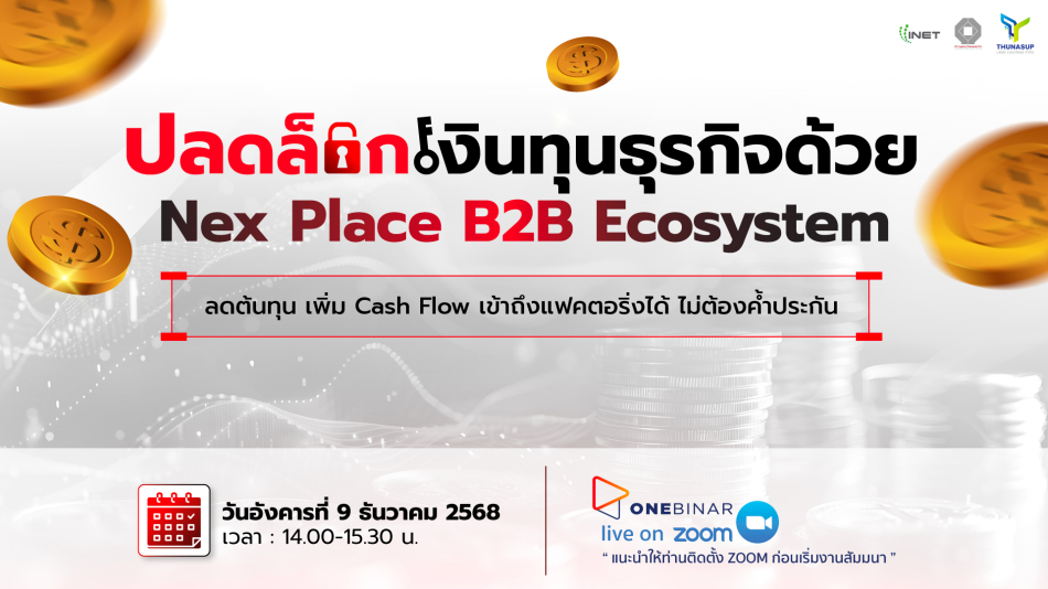 ลงทะเบียนรับชมฟรี กับงานสัมมนาออนไลน์ หัวข้อ “ปลดล็อกเงินทุนธุรกิจด้วย Nex Place B2B Ecosystem: ลดต้นทุน เพิ่ม Cash Flow เข้าถึงแฟคตอริ่งได้ ไม่ต้องค้ำประกัน”