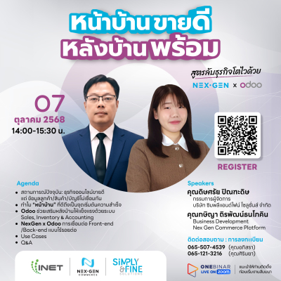 ลงทะเบียนรับชมฟรี กับงานสัมมนาออนไลน์ หัวข้อ “หน้าบ้านขายดี หลังบ้านพร้อม : สูตรลับธุรกิจโตไวด้วย Nex Gen & Odoo”