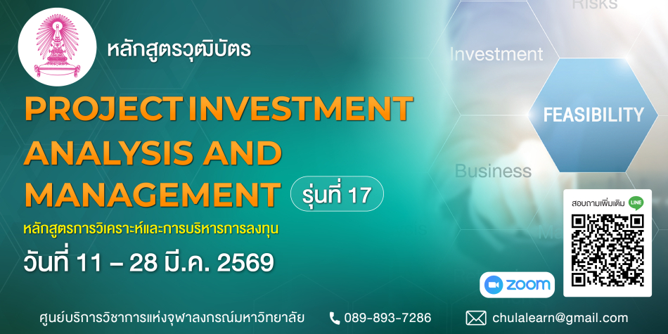 ศูนย์บริการวิชาการแห่งจุฬาลงกรณ์มหาวิทยาลัย จึงเปิดอบรมหลักสูตร “การวิเคราะห์และการบริหารโครงการลงทุน” เพื่อให้ความรู้ หลักคิดและแนวทางการวิเคราะห์ การวางแผนและบริหารโครงการอย่างมีประสิทธิผล รวมถึงเครื่องมือต่าง ๆ ในการประเมินการลงทุนโครงการ (Project Evaluation) การศึกษาความเป็นไปได้ (Project Feasibility Study) การวิเคราะห์ความสามารถในการทำกำไร การวิเคราะห์ฐานะทางการเงิน การเขียนโครงการเพื่อขอสินเชื่อกับสถาบันการเงินและการบริหารความเสี่ยงของโครงการ(Project Risk Management) ตลอดจนศึกษาถึงการตัดสินใจภายใต้สถานการณ์ความไม่แน่นอนและกรณีศึกษา