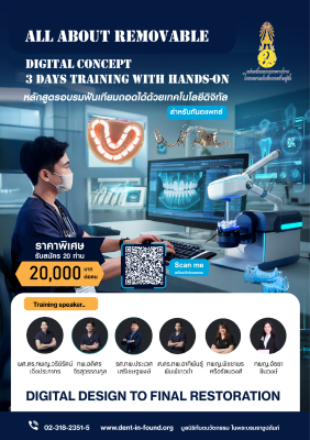 หลักสูตรพัฒนาศักยภาพทันตแพทย์สู่ยุคดิจิทัล เน้นการทำฟันเทียมถอดได้ด้วยเทคโนโลยีสมัยใหม่ สามารถนำไปใช้งานจริงในคลินิกได้ทันที เหมาะสำหรับทันตแพทย์ที่ต้องการเพิ่มพูนความรู้ด้านฟันเทียมถอดได้ และการใช้งานร่วมกับรากเทียมอย่างมีประสิทธิภาพ ภายใต้การดูแลของผู้เชี่ยวชาญ