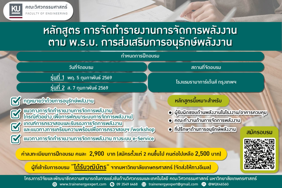 มหาวิทยาลัยเกษตรศาสตร์ โดยโครงการวิจัยและพัฒนาขีดความสามารถในการแข่งขันด้านวิศวกรรมและเทคโนโลยี คณะวิศวกรรมศาสตร์ จึงได้จัดหลักสูตร "การจัดทำรายงานการจัดการพลังงานตาม พ.ร.บ. การส่งเสริมอนุรักษ์พลังงาน" ขึ้น เพื่อให้ผู้เข้ารับการฝึกอบรมรับทราบสาระสำคัญของแบบฟอร์มรายงานการจัดการพลังงาน และมีความเข้าใจแนวทางการจัดทำรายงานการจัดการพลังงานให้เป็นไปตามแบบฟอร์มใหม่ตามที่กฎหมายกำหนด รวมถึงได้มีโอกาสซักถามและรับคำปรึกษาแนะนำจากวิทยากรผู้ทรงคุณวุฒิ อันจะส่งผลให้โรงงาน/อาคารควบคุมสามารถดำเนินการจัดการพลังงานได้ตามเป้าหมายที่กำหนด ควบคู่ไปกับการปฏิบัติที่ถูกต้องสอดคล้องกับกฎหมาย