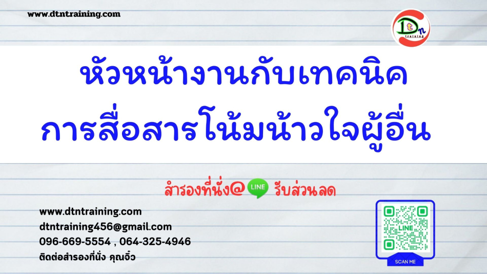 ·      มีหลักการและเทคนิคในการสื่อสารโน้มน้าวใจผู้อื่นให้ทำตามได้อย่างมีประสิทธิภาพ ไม่ว่าจะอยู่ในสถานะของหัวหน้ากับ    ลูกน้อง ผู้ให้บริการกับลูกค้า และผู้ที่ต้องทำงานร่วมกันในองค์กร