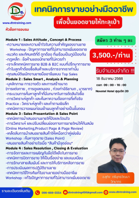 -          เพื่อให้ผู้เข้าอบรมพัฒนาประสิทธิภาพของการขายให้เป็นมืออาชีพมากยิ่งขึ้นเพื่อการเพิ่มยอดขายได้อย่างต่อเนื่อง