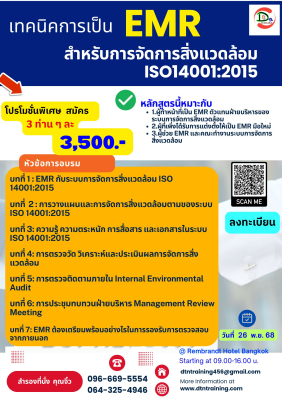 หลักสูตร "เคล็ดลับสู่ความสำเร็จของ EMR มืออาชีพกับระบบการจัดการสิ่งแวดล้อม ISO 14001:2015" นี้เหมาะสำหรับผู้ทำหน้าที่ EMR เพื่อให้เกิดความรู้ความเข้าใจข้อกำหนดของระบบการจัดการสิ่งแวดล้อม ISO 14001:2015  เข้าใจบทบาทหน้าที่และความรับผิดชอบของการเป็นตัวแทนฝ่ายบริหารด้านระบบการจัดการสิ่งแวดล้อม สามารถกำหนดแนวทางการขับเคลื่อนให้แต่ละกระบวนการมีการดำเนินการอย่างถูกต้องครบถ้วนตามข้อกำหนดเพื่อให้มั่นใจว่า EMR มีความเป็นมืออาชีพและสามารถขับเคลื่อนองค์กรสู่ความสำเร็จตามระบบการจัดการสิ่งแวดล้อมได้อย่างมีประสิทธิภาพตามมาตรฐานสากล