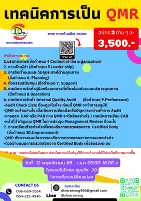 หลักสูตร "เทคนิคการเป็นQMR" ช่วยให้ผู้เป็น QMR ที่ดูแลงานหลายด้าน หรือ QMR มือใหม่ รวมถึงผู้ที่กำลังจะเป็น QMR ได้เข้าใจบทบาทหน้าที่ของ QMR ว่ามีอะไรบ้าง และงานแต่ละอย่างของ QMR ต้องทำอย่างไรจึงจะดำเนินการไปได้อย่างครบถ้วนและมีประสิทธิภาพ
