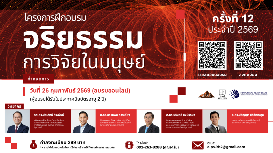 สมาคมนิติศาสตร์และรัฐศาสตร์ ได้แต่งตั้ง คณะกรรมการจริยธรรมการวิจัยในมนุษย์ สมาคมนิติศาสตร์และรัฐศาสตร์ (Institutional Review Board, Association of Legal & Political Studies: ALPS-IRB) ขึ้นเพื่อกำกับดูแลโครงการวิจัยที่ดำเนินการเกี่ยวข้องกับมนุษย์ ของบุคลากรภายในสมาคมฯ และส่งเสริมการดำเนินการวิจัยเกี่ยวกับมนุษย์แก่บุคคลภายนอก ให้เป็นไปด้วยความเรียบร้อยตามเกณฑ์จริยธรรมที่เป็นสากล มีประสิทธิภาพ และสอดคล้องกับสถานการณ์ โดยจัดโครงการอบรมจริยธรรมการวิจัยในมนุษย์ ให้กับบุคคลทั่วไป ตลอด 2 ปีที่ผ่านมา มีผู้สนใจเข้าร่วมเป็นจำนวนมาก เพื่อตอบสนองความต้องการและความต่อเนื่อง สมาคมฯ จึงมีกำหนดจัดอบรมครั้งที่ 12 ประจำปี 2569 ในวันพฤหัสบดี ที่ 26 กุมภาพันธ์ 2569 (อบรมออนไลน์) โดยผู้ผ่านการอบรมจะได้รับประกาศนียบัตร อายุ 2 ปี