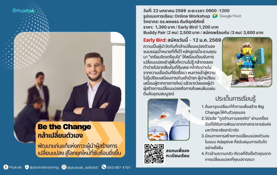 หลักสูตรนี้จะชวนคุณมา “เตรียมจิตเตรียมใจ”ห้พร้อมต้อนรับการเปลี่ยนแปลงเข้าสู่พื้นที่ความไม่รู้ กล้าทดลองทำต่างไปจากสิ่งเดิมที่คุ้นเคย กล้าคิดต่างไปจากความเชื่อเดิมที่ยึดถือมา หนทางเข้าสู่ความไม่รู้เปรียบเสมือนการเดินเข้าป่ารก ผู้นำเปรียบเสมือนผู้ถากถางทางใหม่ แล้วรางวัลของผู้นำผู้สร้างการเปลี่ยนแปลงคือการค้นพบผืนแผ่นดินอันอุดมสมบูรณ์