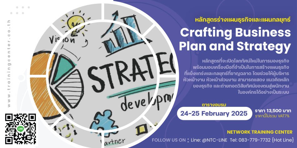 Crafting Business Plan and Strategy (ร่างแผนธุรกิจและแผนกลยุทธ์ : 2 วัน) หลักสูตรที่จะเปิดโลกทัศน์ใหม่ในการมองธุรกิจ พร้อมมอบเครื่องมือที่จำเป็นในการสร้างแผนธุรกิจที่แข็งแกร่ง และกลยุทธ์ที่ชาญฉลาด โดยช่วยให้ผู้บริหาร หัวหน้างาน หัวหน้าส่วนงาน สามารถแสดงแนวคิดหลักของธุรกิจและถ่ายทอดวิสัยทัศน์ของตนสู่พนักงานในองค์กรได้อย่างเป็นระบบ