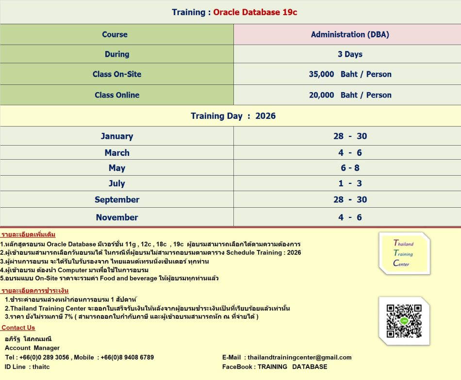 หลักสูตร Oracle Database 19c Administration (DBA) เป็นหลักสูตรเข้มข้น 3 วัน ที่ออกแบบมาเพื่อมอบความรู้และทักษะที่จำเป็นสำหรับการบริหารจัดการฐานข้อมูล Oracle Database 19c อย่างมีประสิทธิภาพ ผู้เข้ารับการอบรมจะได้เรียนรู้ตั้งแต่พื้นฐานสถาปัตยกรรม การติดตั้ง การสร้างฐานข้อมูล ไปจนถึงการจัดการผู้ใช้ ความปลอดภัย การตรวจสอบประสิทธิภาพ และการสำรองและกู้คืนข้อมูล ซึ่งเป็นทักษะสำคัญสำหรับผู้ดูแลระบบฐานข้อมูลมืออาชีพ