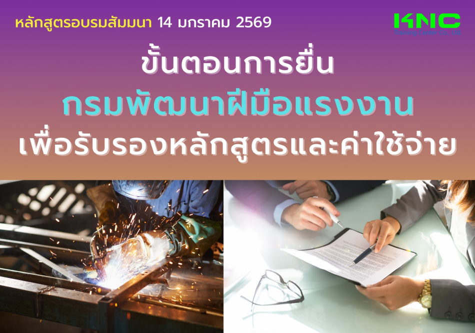 หลักสูตร ขั้นตอนการยื่นกรมพัฒนาฝีมือแรงงาน เพื่อรับรองหลักสูตรและค่าใช้จ่าย เน้นเนื้อหาที่สอดคล้องกับกฎหมายและระเบียบข้อบังคับของกรมพัฒนาฝีมือแรงงาน พร้อมทั้งเพื่อให้ผู้ที่รับผิดชอบในการพัฒนาบุคลากรภายในองค์กร เรียนรู้ขั้นตอน เทคนิค ในการจัดทำเอกสาร การดำเนินการอบรม การยื่นเอกสารขึ้นทะเบียนอบรม ยื่นเอกสารค่าใช้จ่ายอบรม เพื่อให้กรมพัฒนาฝีมือแรงงานรับรอง