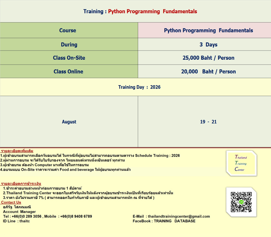 เปิดอบรมหลักสูตร Python Programming Fundamentals หลักสูตร Python Programming Fundamentals จะช่วยให้คุณเข้าใจพื้นฐานของการเขียนโปรแกรมด้วย Python และเป็นพื้นฐานที่ดี ในการต่อยอดไปสู่ระดับขั้นสูงของการเขียนโปรแกรมด้วยภาษา Python หรือเทคโนโลยีอื่นๆ ที่ใช้ Python เป็นภาษาหลัก หลักสูตร Python Programming Fundamentals เป็นหลักสูตรที่ออกแบบมาเพื่อให้ความรู้และทักษะพื้นฐานในการเขียนโปรแกรมด้วยภาษา Python ซึ่งจะมุ่งเน้นในการสอนเรื่องพื้นฐานเช่นการประกาศตัวแปร การทำงานกับตัวแปร การควบคุมการทำงานของโปรแกรมด้วยคำสั่งเงื่อนไขและการทำซ้ำ การใช้ฟังก์ชันพื้นฐาน เป็นต้น