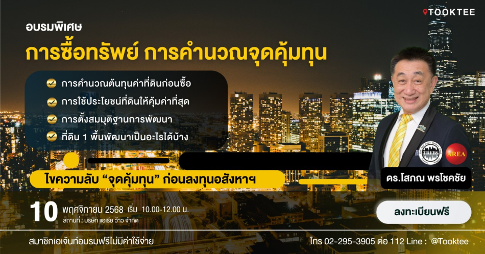 ขอเชิญอบรม Tooktee Agent: การซื้อทรัพย์ การคำนวณจุดคุ้มทุน