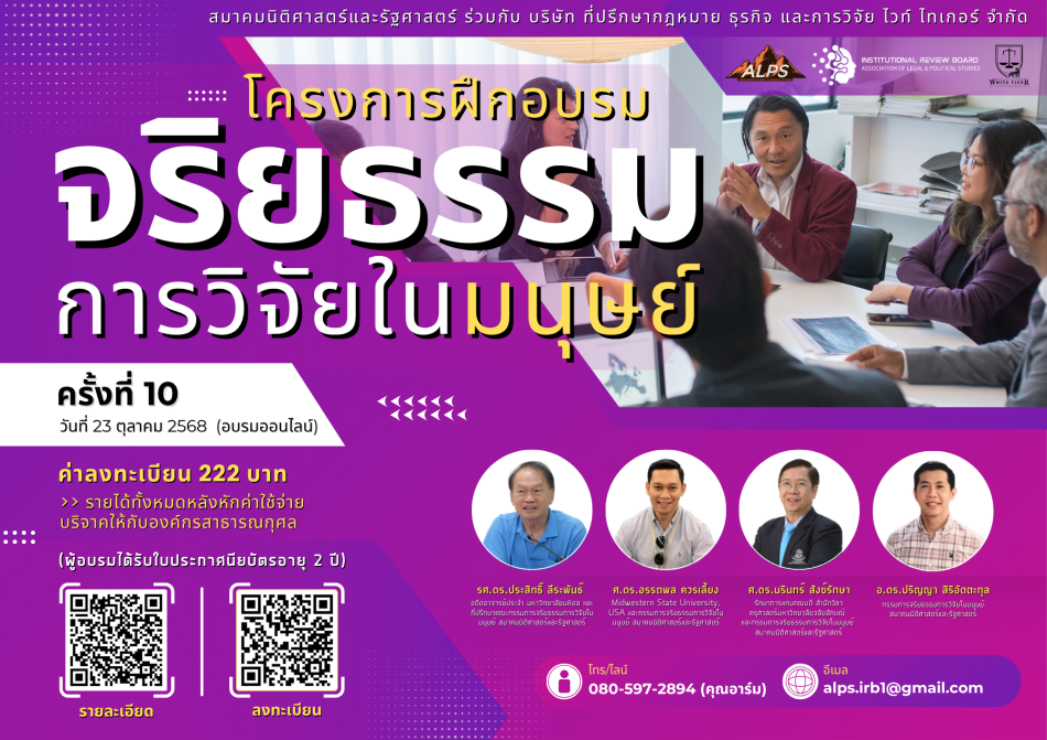 ในปี2567 ที่ผ่านมา สมาคมนิติศาสตร์และรัฐศาสตร์ ได้แต่งตั้ง คณะกรรมการจริยธรรมการวิจัยในมนุษย์ สมาคมนิติศาสตร์และรัฐศาสตร์ (Institutional Review Board, Association of Legal & Political Studies: ALPS-IRB)ขึ้นเพื่อกำกับดูแลโครงการวิจัยที่ดำเนินการเกี่ยวข้องกับมนุษย์ ของบุคลากรภายในสมาคมฯ และส่งเสริมการดำเนินการวิจัยเกี่ยวกับมนุษย์แก่บุคคลภายนอก ให้เป็นไปด้วยความเรียบร้อยตามเกณฑ์จริยธรรมที่เป็นสากล มีประสิทธิภาพ และสอดคล้องกับสถานการณ์ โดยจัดโครงการอบรมจริยธรรมการวิจัยในมนุษย์ ให้กับบุคคลทั่วไป ในปี2568 เพื่อความต่อเนื่อง สมาคมฯ จึงมีกำหนดจัดอบรมครั้งที่ 10ในวันพฤหัสบดี ที่23ตุลาคม2568 (อบรมออนไลน์) โดยผู้ผ่านการอบรมจะได้รับประกาศนียบัตร อายุ2 ปี