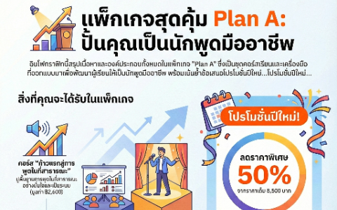 4 คอร์สนี้คือทางลัด ที่จะเปลี่ยน "เสียงธรรมดา" ให้กลายเป็น "เครื่องมือทรงพลัง" รวมเทคนิคการพูด + พรีเซนต์ + เขียนบทพูดแบบเข้าใจง่าย ใช้ได้จริง เมื่อคุณ "พูดเป็น" ทุกเวทีจะกลายเป็น "ของคุณ"