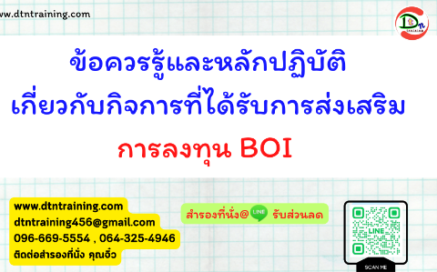 เงื่อนไขและสิทธิประโยชน์ในบัตรส่งเสริมการลงทุน BOI การวางระบบบัญชีให้เหมาะสมกับกิจการ BOI และ NON -BOI ประเภทเอกสารที่ใช้ประกอบการบันทึกบัญชีหลักเกณฑ์การปันส่วนต้นทุน ค่าใช้จ่ายในการขายและค่าใช้จ่าย ทำอย่างไรให้ได้สิทธิประโยชน์ด้านภาษีเหล่านี้ ยกเว้นภ
