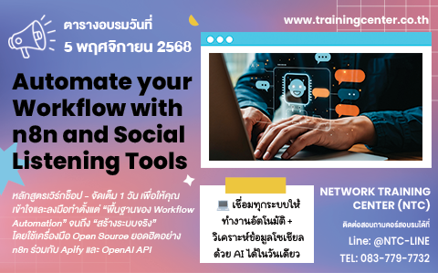 เปิดตัวหลักสูตรใหม่ Automate Your Workflow with n8n & Social Listening Tools เชื่อมทุกระบบให้ทำงานอัตโนมัติ + วิเคราะห์ข้อมูลโซเชียลด้วย AI ได้ในวันเดียว แม้ไม่มีพื้นฐานเขียนโค้ด ก็สามารถเรียนรู้ได้